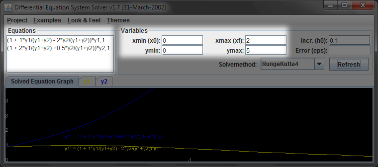 (1 + 1*y1/(y1+y2) -2*y2/(y1+y2))*y1,1 (1 + 2*y1/(y1+y2) +0.5*y2/(y1+y2))*y2,1The first line specifies dy1/dt, and the second line specifies dy2/dt. The ",1" appended to each line is an initial condition. Set the range of time, x, from 0 to 2 and the range of the dependent variable, y, from 0 to 5.